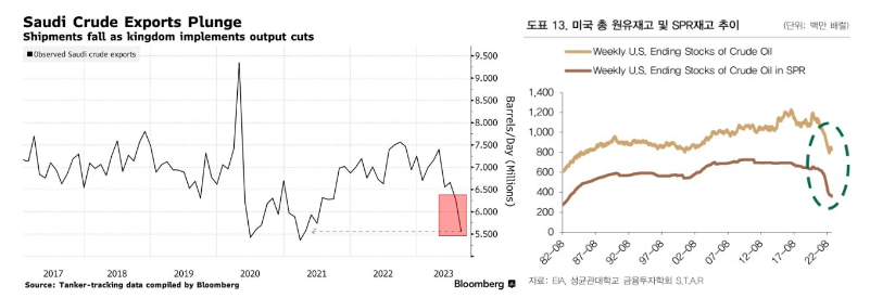 왼쪽 사진이 사우디 원유 수출 물량, 오른쪽이 미국 전략적 비축유 물량 자료입니다.