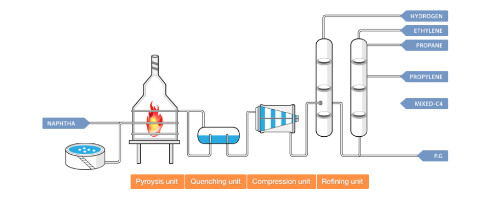 석유화학업계에서는 납사를 정유업체로부터 구입해 고온으로 열분해 해서 에틸렌, 프로필렌, 부타디엔, 스타이렌 등의 모든 석유화학 원료들을 생산하여 고분자 제조업체에 판매합니다.