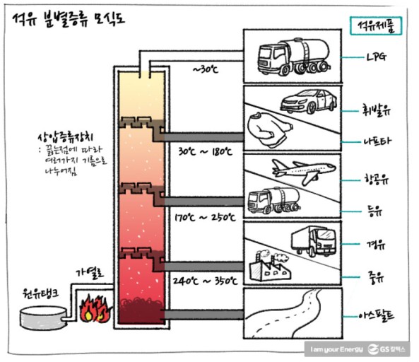 정유는 분별증류에 의해서 원유가 나뉘게 됩니다. 분별증류는 여러 가지 액체 혼합물의 끓는점 차이를 이용해 분리하는 방법입니다.