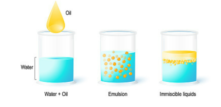 에멀션은 위 그림과 같이 물과 기름처럼 섞이지 않는 두 액체를 흔들어 섞으면 한 액체가 작게 나뉘며 또 다른 액체 속에 퍼지는 현상을 의미합니다. 에멀션의 가장 대표적인 예는 동물의 젖으로, 이를 유탁액이라고 합니다.