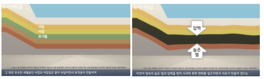 유기기원설 : 수십억 년 전 물속의 미생물들이 죽으면서 물 밑에 가라앉게 되고, 그 위로 무수한 세월동안 사암과 이암같은 흙이 뒤덮이면서 퇴적층이 만들어진다. 이것이 땅속의 높은 열과 압력을 받아 서서히 화학 변화를 일으키면서 석유가 만들어졌다는 주장