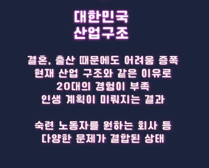 그리고 높은 스펙과 현실을 마주하여, 청년들의 눈은 높아져 있는 상태입니다. 대기업은 정말 소수에 불과하지만 명성이 보장된 곳이기에 많은 사람들이 노리고 있는 곳이죠. 대기업들은 고임금 부담이 가능하지만, 대부분 중소 제조업과 우리나라 서비스들은 고임금 부담이 안 되는 상황이기 때문입니다. 이에 따라 대기업에 몰리는 현상이 우리나라 산업 구조에서 대표적으로 보입니다.