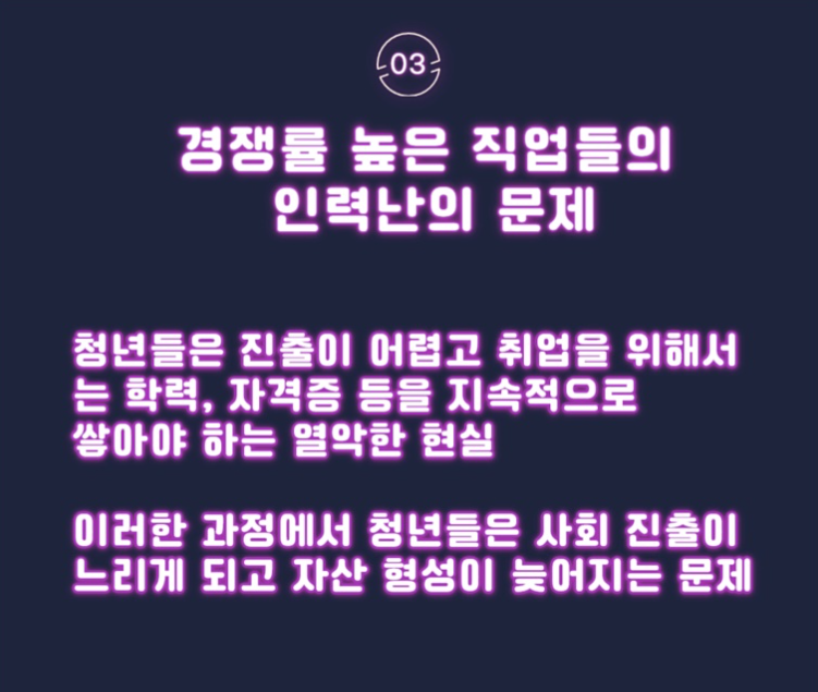 최근에는 공채 숫자마다 크게 줄어들면서 신입 공채는 옛날 일로 되어가고 있습니다. 유명한 대기업마저도 경력을 채용하는 세상 그리고 경쟁이 치열한 하위 산업 분야에서는 심각한 인력난을 겪고 있습니다. 이에 따라 청년들은 진출이 어렵고 취업을 위해서는 학력, 자격증 등을 지속해서 쌓아야 하는 열악한 현실에 마주하고 있습니다. 요구하고 있는 스펙은 높아져 가는데 취업 문은 작아졌으니 더욱 힘들 수밖에 없습니다.