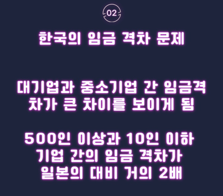 한국에서는 대-중소기업과 직종에 따른 임금 격차가 넓어졌고, 더욱 벌어지고 있어요. 같은 기업이더라도, 전에는 임금 격차가 크지 않았으나 이제는 상당한 격차가 생겼습니다. 대기업과 중소기업 간인 남은 큰 차이와 500인 이상과 10인 이하 기업 간의 임금 격차가 일본의 대비 거의 2배나 벌어졌습니다. 이러한 증상을 보면 제조업부터 건설업, 조선업 등 인력난이 발생하는 업종에서 작업자들의 상대적인 낮은 임금과 불균형적인 임금 낙하율이 우려되고 있습니다. 높아지는 물가상승률을 생각한다면 임금은 그만큼 올라가지 않았다는 점도 주목해볼만주목해 볼 만합니다.