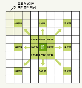 8가지의 하위목표를 달성하기 위한 계획을 8개씩 작성합니다. 작성하는 것이 힘들 수도 있지만 그 과정에서 계획과 목표는 명확해지니 시간이 조금 걸리더라도 좋은 액션 플랜을 설정하는 것이 중요합니다.