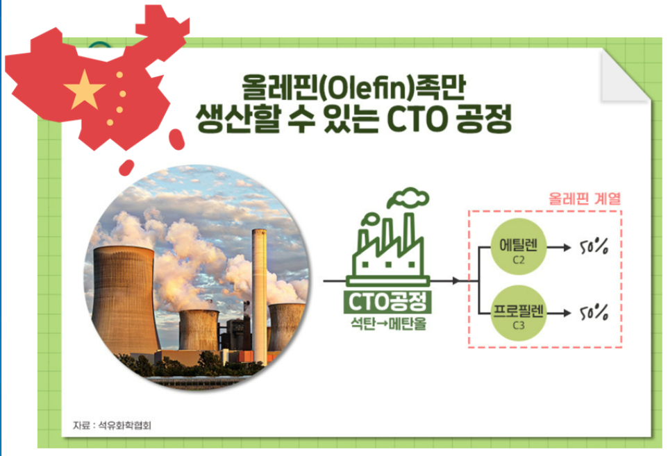 하지만, 이제 미국과 어깨를 나란히 하는 중국도 석유화학제품을 스스로 만들 수 있게 되었습니다. 그러다 보니, 그동안 중국 혜택을 받았던 국내 석유화학업체들에 비상등이 켜졌습니다. 중국의 석유화학제품 생산방식은 NCC가 아닌 CTO라고 하는데요. 중국은 석탄 매장량 + 수입량이 압도적인 국가이죠. 그러다 보니, 석탄을 통해서 석유화학제품을 만들게 됩니다. 그래서, CTO의 약자가 Coal(석탄에서) To Olefin(에틸렌, 프로필렌 = 올레핀족)이란 뜻입니다. 정확히 말하면, 석탄에서 메탄올을 만들고 이 메탄올을 통해 에틸렌, 프로필렌을 만듭니다.