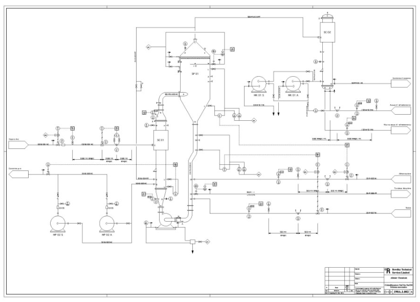 플랜트 프로세스에 있어 배관 및 계측, 제어 장치, 설비를 세세하게 나타낸 도면입니다.