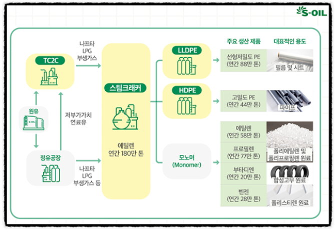 정유 공정에서 나오는 저렴한 가격의 중유 제품을 화학제품 원료로 전환하는 공정을 스팀 크래커를 이용하여 저렴한 가격에 원료를 조달하는 만큼 가격 경쟁력이 여타 설비에 비해 높다는 평가입니다.
